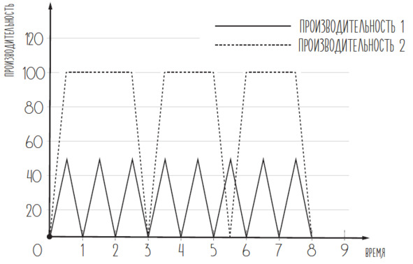 Самый эффективный способ добиться высокой производительности – структурировать свой рабочий день таким образом, чтобы временные отрезки на выполнение работы были более продолжительными (верхняя диаграмма на графике). Это возможно, когда вам не надо выполнять десятки разноплановых дел одновременно.