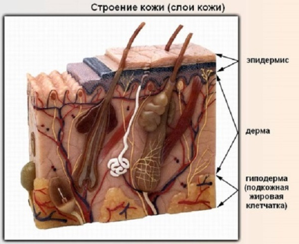 Кожа, несмотря на то, что в среднем толщина ее всего каких-то 1—2 мм, похожа на многослойный бутерброд. Она состоит из поверхностного эпидермиса, заключенного в 5 слоев постоянно обновляющихся клеток; внутренней прослойки – дермы, 2 слоя которой являются каркасом, обеспечивающим упругость, растяжимость и прочность кожным покровам; и гиподермы, подкожной жировой «подушки». Кроме того, в толще кожи расположены нервные волокна, рецепторы, волосяные луковицы, лимфатические и кровеносные сосуды.