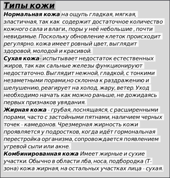 Итак, у людей бывают разные типы кожи, требующие специальных подходов к вопросам ухода. Однако свежесть и ухоженность кожи любого типа зависит, в первую очередь, от процесса обновления клеток эпидермиса, о котором мы уже говорили, когда разбирали строение кожи.