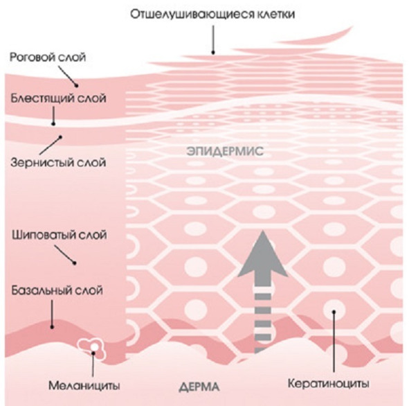 Чтобы кожа выглядела молодой, свежей и сияющей, нужно чтобы она планомерно отшелушивала верхний роговой слой, старые омертвевшие чешуйки. Это постоянный непрерывный поток, иначе, мы были бы похожи на бронтозавров. В течение жизни человек сбрасывает более 20-и килограмм ороговевших клеток кожного покрова. Ошеломляющая цифра – в день мы их теряем что-то около 10 миллиардов. Кожа самоочищается – вместе с омертвевшими клетками удаляются все вредные для кожи вещества. Эпидермис целиком обновляется, клетки воспроизводят новые слои так, как в них это заложено на генетическом уровне. Они в точности заменяют старый слой на совершенно новый, с характерными для каждого человека конкретными особенностями: все родинки, веснушки, ямочки и рубчики остаются на прежних местах. Вот поэтому иногда бывает так трудно избавиться от пигментного пятна или шрама.