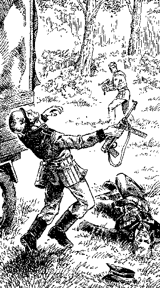 Димка отвел правую руку назад и с силой швырнул карабин в нациста. Потом сразу пригнулся, прыгнул в сторону, и вдруг что-то ударило его в бок, потом в плечо, обожгло на секунду. Он остановился удивленный, прижал руку к груди, смотрел, как расплывается под пальцами черно-красное пятно, мокрое и липкое. И все кругом стало черно-красным и липким, погасли звук и свет. И Димка уже не услышал ни грохота еще одного выстрела, ни шелеста шагов поблизости, ни монотонного шума дождя, который припустил сильнее и чаще.