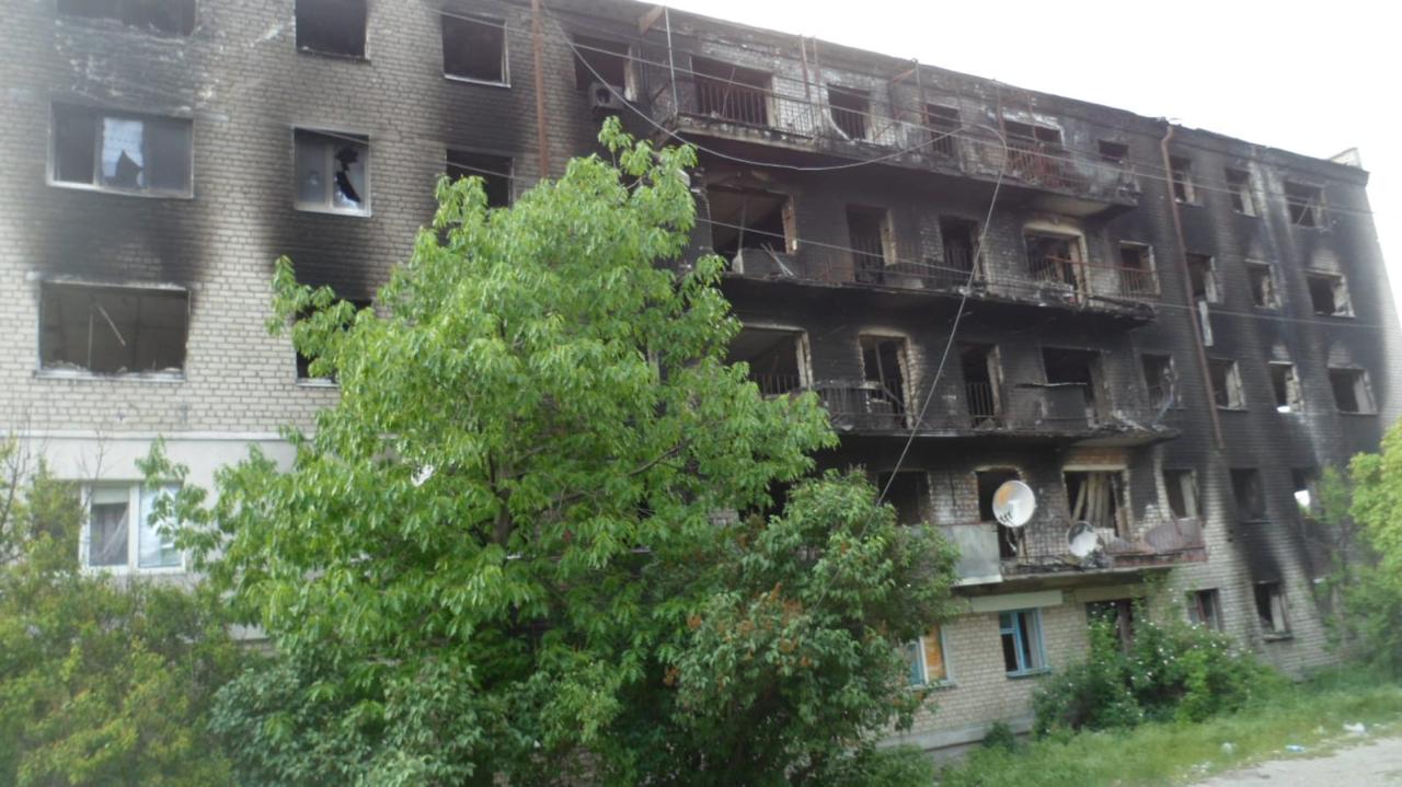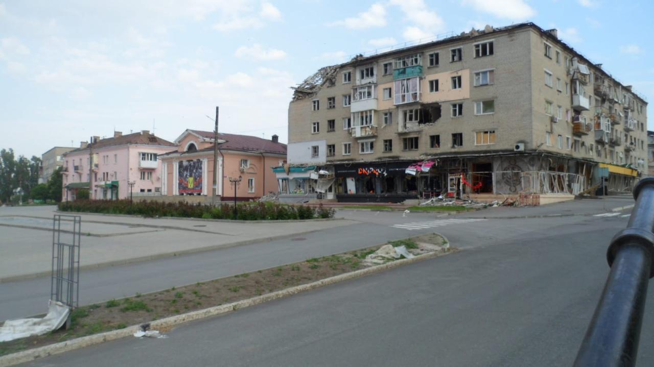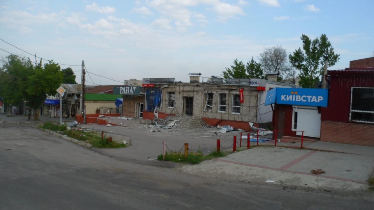 И вот он – город. Нет домов, которых не затронула война. Многоэтажки в дырах, без крыш и окон. Разрушены и разграблены магазины. Редкие проходящие жители. Остановились на перекрестке, встретились взглядом с пожилой женщиной. Что смотришь? Злобно смотрела в мою сторону. Да, не все здесь нам рады. Люди настроены по-разному.