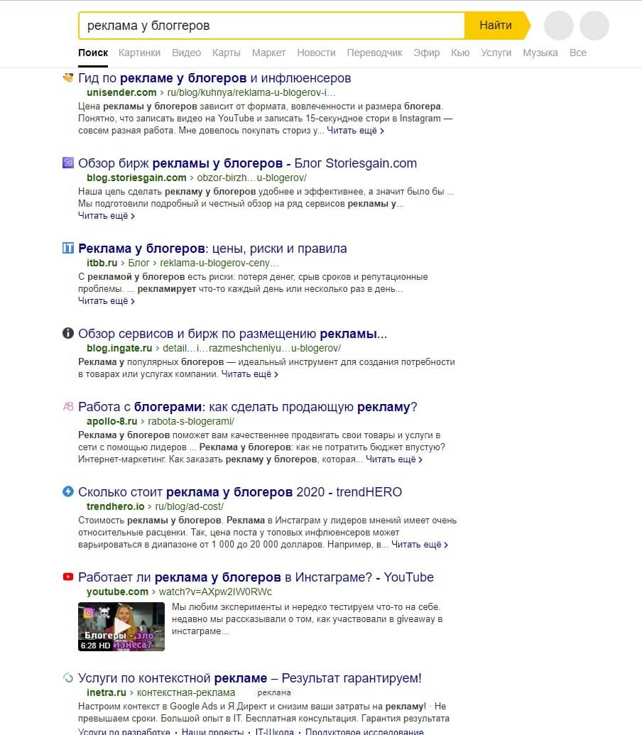 Просматривая результаты, вы увидите, что у каждого описания сайта первого экрана есть фраза «реклама у блогеров».