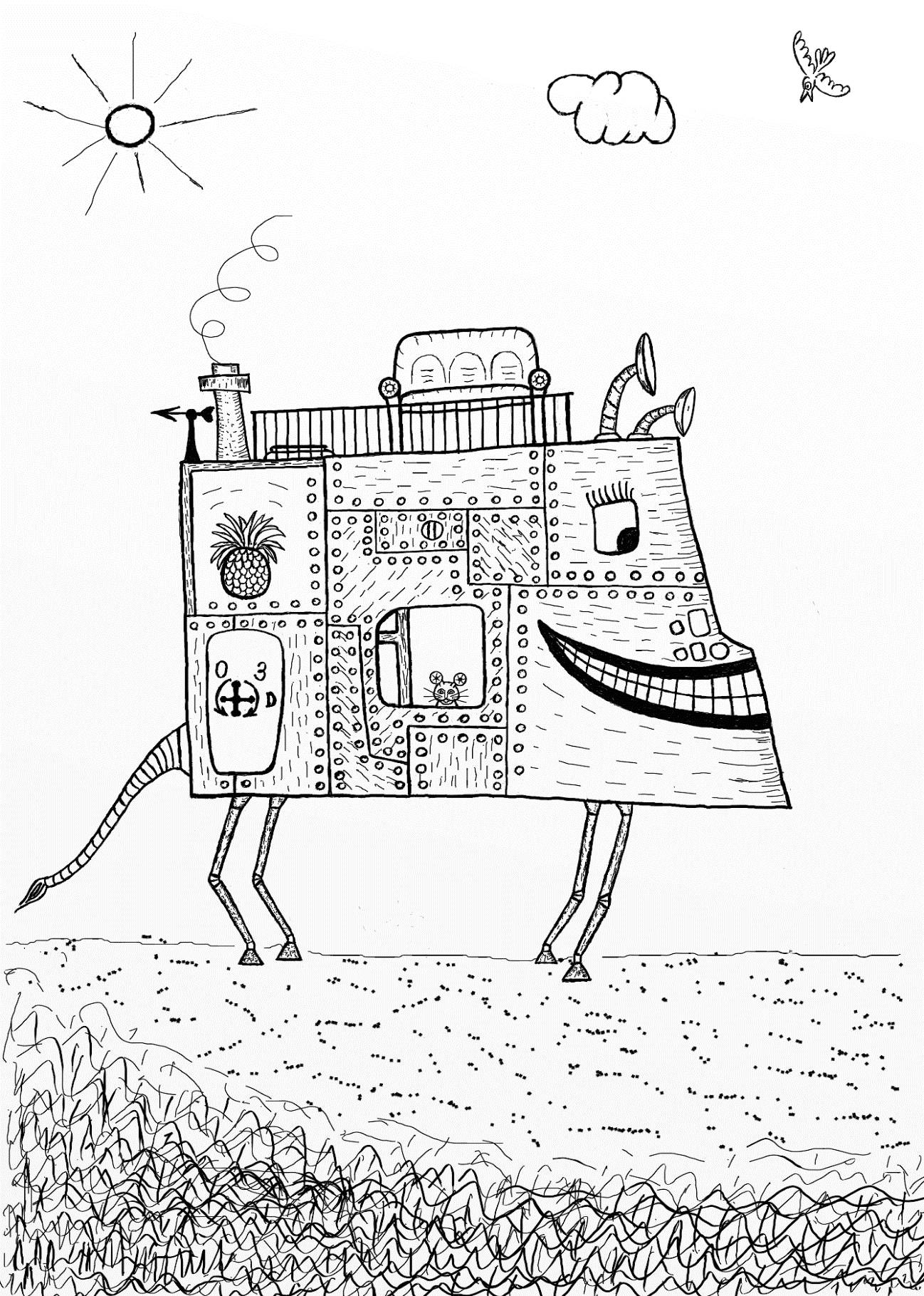 роботизированная кошка. У неё тоже есть хвостик и маленькие тарелочки вместо ушей. Побежала она мышей ловить в исследовательских целях. Ты хотел за ней погнаться, а потом сдержался. Пока будешь гоняться, утюг может улететь, и ты не узнаешь, что у него внутри. Заходишь внутрь, а там целая комната, и лесенка ведёт наверх, прямо к люку. Вылезаешь на крышу, а там стоит мягкий диван. «Робик» знает, что гостям будет приятно поспать на мягком диване.