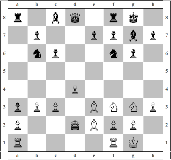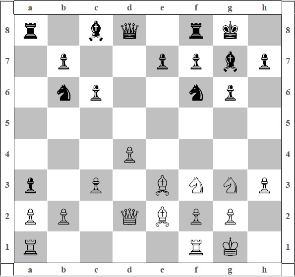 1) b3 Kf6, 2) Cb2 g6, 3) C:f6 ef. Итак, при сделанном ходе автор будет отмечать плюс и минус сделанного хода, для каждой стороны выделяя свои действия шрифтом, чтобы это было понятно читателю: A) для Белых; Б) для Черных. А для читателя рекомендую взять чистый лист бумаги, ручку и отмечать плюсы и минусы сторон. Баланс плюсов и минусов подсчитаем по подсказке автора.