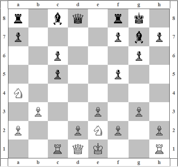 4) K:e4 Kf6, 5) Kg3 Kbd7, 6) Kf3 g6, 7) Ce2 Cg7, 8) 0–0 0–0, 9) c3 Kb6, 10) h3 a5, 11) Ce3 a4, 12) Фd2. НЕ очень понятно желание Белых игнорировать пешку a Черных. Присмотреться к ней стоило бы, потому что пешка проходит дальше. 12) …а3 и позиция на диаграмме 22. Выбора между хорошим и плохим продолжением нет, любое продолжение у белых имеет свои минусы. Белые выбирают – 13) b3.