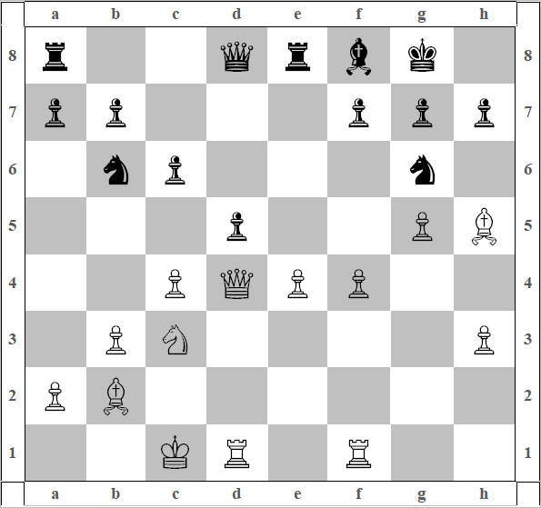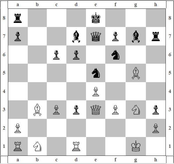 11) h3 C:f3, 12) C:f3 Лe8. Перед нами перекресток множества путей, и большая вероятность пойти не туда (диаграмма 30). Что можно порекомендовать Читателю? Учитывая пешечное расположение Черных, можно с большой долей вероятности предположить, что Черные атаковать на королевском фланге не будут, вернее, при помощи своих пешек не будут, а для чёрных фигур нет пространства для разбега. С этой точки зрения стоило предпочесть ход 13) 0–0. (С возможной дальнейшей игрой на 100 ходов, с перевесом). 13) 0–0–0 Белые хотят не просто выиграть, а сокрушить соперника. Похвально, но обычно влечёт такую психологическую ошибку, как недооценку сил, а главное, возможностей соперника, и дает встречную игру Чёрным. Например, 13) …а5, 14) …а4 и полное равенство, причем приятнее играть как раз Чёрным. Но они медлят 13) …Фс7, и Белые идут дальше, 14) g4. Уже сейчас я понял, что мату на h8 быть. 14)…Cf8. На самокате 15) g5 Kfd7. Сделанный ход 16) Ch5 (по меньшей мере, самобытен), но перевес уменьшает (диаграмма 31); (простой же ход 16) h4, с опережающим простым накатом h5-h6 —