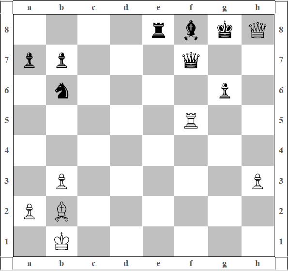 25) Кf6!!! Где-то сейчас в небе громыхнул гром, и БОГ в голове автора подумал: «Катастрофа неминуема, спасения нет, БОГ соперника ничего не слышит»). 25) …Л:f6. Этот ход, робкая попытка выбраться из волны мирового потопа. 26) gf. Но, могучим ураганом всё учтено. 26) …g6. Последнее волевое усилие не утонуть, пресекается на корню.
