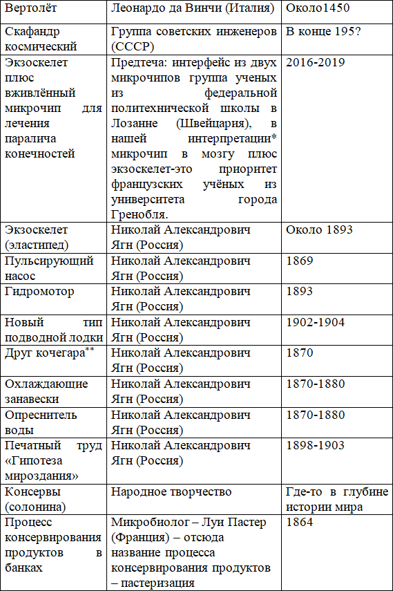 В этой главе мы будем говорить об искусственном сдвоении, сдвоении, как осознанном приеме жизнебытия при преодолении препятствия. Ведь препятствие, это – недружелюбное к тебе материальное или нематериальное действие. И преодолеть его лучше живым, и, желательно, без потерь. Скажи, пожалуйста, читатель, кто, в нашей истории, придумал скафандр? И, главное, когда придумал? Ответ за таблицей.