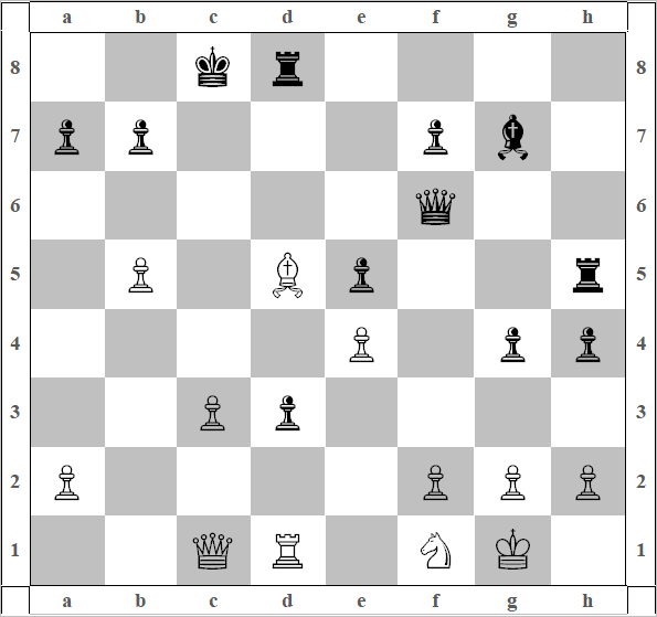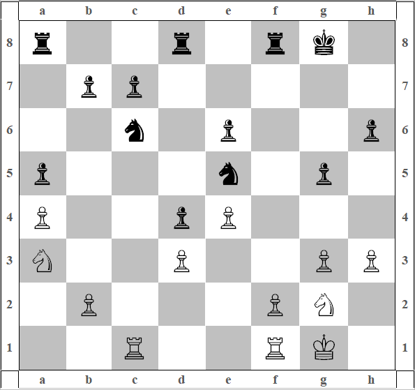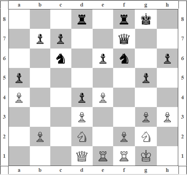 17) Лаf1 Kf6. Конь отошел, но пообещал вернуться! 18) Фd1 d4, 19) cd ed. Пешки черных раздвоились, а вот поле e5 Чёрные оставили, присвоили себе. 20) Лее1 g5 белый конь получает направляющий импульс в филейную часть, который приводит его в офсайд[36] 21) Kg2 и положение после 21-го хода белых на диаграмме 34. В этой, безусловно, интересной позиции, Уэсли применяет типовой план (конструкция второго порядка). И звучит он так: В ПОЗИЦИИ БЕЗУСЛОВНОЙ СОБСТВЕННОЙ ДОМИНАЦИИ сбрасываются (размениваются) все фигуры, не имеющие преобладания перед фигурами соперника[37]. В этой конкретной позиции такая фигура у чёрных только одна – Ферзь.