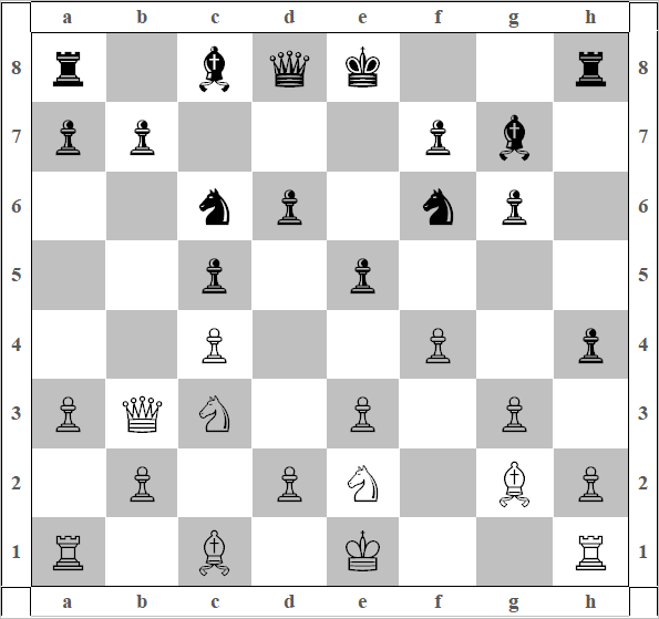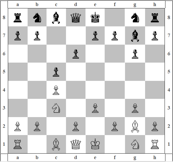 Марсель 262(2363) – Автор (2250). 31.05.20201) с4 с5. 2) Кс3. Новое, это давно забытое старое дебютной теории. Начало называется английским, и имеет несколько иные возможности для Белых, нежели традиционное продолжение d4. Хотя, при известном желании, всё можно свести к обычному ферзевому гамбиту после некоторой перестановки ходов. 2) …d6, (уже мимо ферзевого гамбита) 3) g3 g6, 4) Cg2 Cg7. 5) e3.