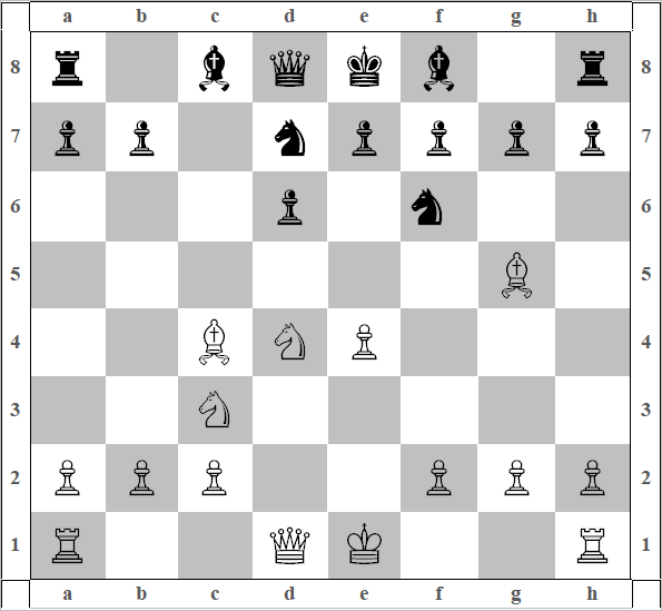 Только что Белые сделали не самый сильный ход из достаточно большого и приятного выбора. Годилось штук 5 примерно одинаковых продолжений: Kf3, Kh3, e4, Фc2, Фb3. Теперь выбор за Чёрными и 5) …Kc6, на доске – жесткое равенство. И это следствие одного неверного хода 5) e3. Уменьшилась ли энергия Белых? Безусловно. Уменьшилось ли Время жизни Белых? Это зависит от Чёрных, если предположить, что Время на шахматной доске строго зафиксированная величина. Вернее, он (объём времени) напрямую зависит от энергии, которую генерируют шахматные фигуры, (ВРЕМЯ – ЭНЕГИЯ ПО КОЗЫРЕВУ), как сами по себе, так и в непосредственном единоборстве с фигурами соперника. В учебнике «Шахматы. Первое приближение» присутствует текст о сравнительной энергии шахматных фигур. И как отправной базис для выбора хода той или иной фигурой он, безусловно, стартовая локация. Остаётся только пожалеть соперника, не прочитавшего этот труд автора. Энергию каждой фигуры автор (на доске полное равенство) будет записывать в скобочках после хода каждой фигуры, и мы будем наблюдать так называемый баланс энергии-времени в результате исполненных сторонами ходов. Вышеназванный учебник открываем на странице 60–61, чтобы всё было ясно и понятно.