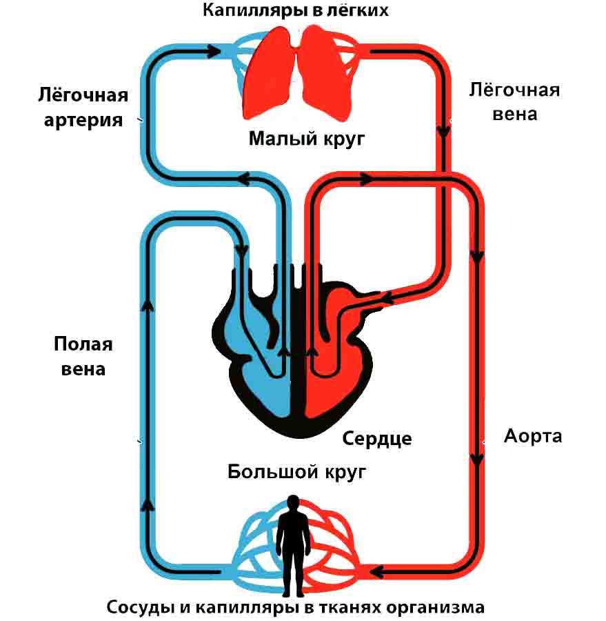 Кровь движется по нашему организму по двум кругам кровообращения, большому и малому кругу. Большой круг – это путь от сердца ко всем тканям и органам и от всех тканей и органов к сердцу. Малый круг – это тракт от сердца к лёгким и обратно к сердцу.