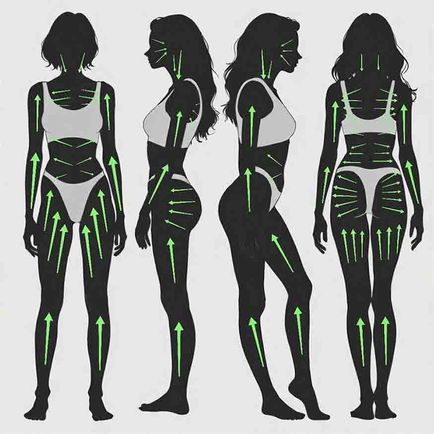 Рисунок №2. Массажные линии (стрелками показаны направления движений, направление движений совпадает с направлением лимфотока в поверхностных тканях)