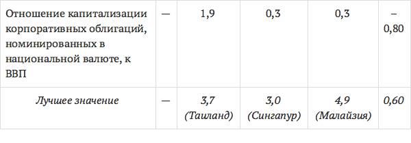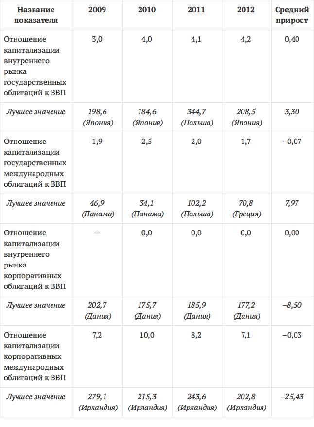 Следует отметить, что в настоящее время облигации играют довольно значимую роль на финансовых рынках. В целом объемы их использования зависят от уровня развития финансовой системы страны, а также степени развития финансового рынка. Российский рынок облигаций не занимает лидирующих позиций в сравнении с другими странами. По рейтинговой оценке Мирового экономического форума российский рынок долговых инструментов находился по уровню развития в 2011 г. на 46-м месте из 62 (по числу стран, по которым проводится исследование), и на 48-м в 2012 г.48 Если рассматривать отдельные показатели, характеризующие рынок, то можно отметить, что как в секторе государственных, так и по корпоративным облигациям российский рынок долговых инструментов очень сильно отстает от стран-лидеров (см. табл. 1.2).