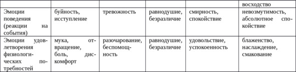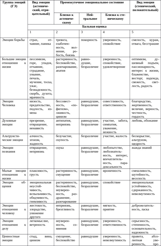 При оценке эмоционального состояния человека следует учитывать парные (дуальные) эмоции, между которыми образуется определенное эмоциональное пространство. Степень приближения к тому или другому полюсу можно оценить в баллах. Причем эмоциональное состояние определенной градации может быть обозначено своим определенным понятием. Дуальные эмоции можно объединить в группы по их содержанию, характеру, значению для человека и окружающих его людей. В конечном итоге формируется карта эмоций (КЭ), формализованная в табличном (Таблица 1) или графическом виде, что позволит человеку позиционировать себя в эмоциональном пространстве (примечание: чтобы не усложнять таблицу, эмоции по модальности и стимулированию активности указаны в одной группе)..