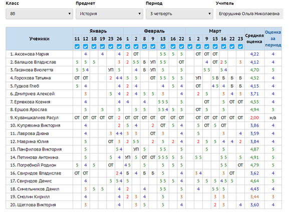 Рисунок 1. Окно классного журнала в АИС «Сетевой город» с указанием средней оценки обучающихся класса.