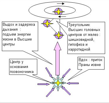 Важно! Вдох и приток извне энергии. Выдох и поднятие энергии по каналу Сушумна в высшие головные центры. Поднятие энергии осуществляется на выдохе, так как при отсутствии дыхания, происходит дефицит кислорода и весь организм настраивается на подпитку мозга, только его, как центра управления всем организмом.
