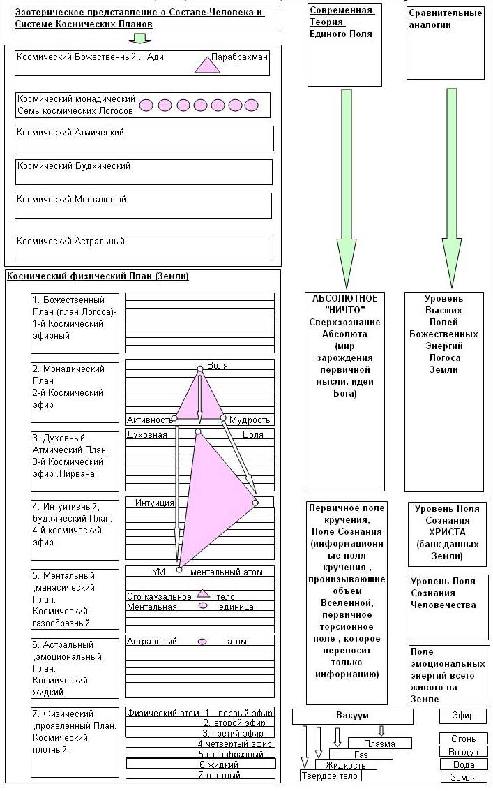 Абсолютное «Ничто» ученых сопоставимо с диапазоном уровней Плана Логоса, Божественного Плана Ади, Монадического и Духовного Атмического планов, в семиричной структуре планов нашей планеты. Это те уровни тонкого плана, где зарождаются идеи Первотворца. Информационное поле Земли, как производная первичных полей кручения, совместимо с общим частотным диапазоном уровней Интуитивного (Будхического), Ментального и Астрального планов. Это уровень облечения Идеи Первотворца в мыслеформу и энергетическую, фантомную оболочку. На этом уровне информационная составляющая Идеи Первотворца дополняется энергетической составляющей: каркасом в эфирном пространстве. Это поле называют Хроники Акаши, банк данных Бога, где хранятся, созданные Творцом возможные, вероятностные версии развития событий, как отдельного человека, так и всей планеты Земля. Физический вакуум, эта эфирная, энергетическая среда, из материи которой строятся каркасы (фантомы) будущих материальных тел, и которые на физическом уровне проявятся как, твердые тела, жидкости, газы и плазма. В эфирной среде присутствует материал для строительства каркасов физических тел: это различные виды энергий созданные Перво Творцом. Физический вакуум это Кристаллическая Решетка Всемирной Космической сети, которая занимает весь объем Пространства Вселенной Вселенных от межатомного пространства до межгалактического. Информационное поле нашей планеты, которое есть производная вторичных полей кручения, создаваемых Сознанием всего человеческого социума, является самым мощным источником торсионного поля Земли. Информационное поле Земли называется Поле Сознания Христа. Объем уровней всех планов планеты, начиная от самого высшего Божественного АДИ до эфирного, энергетического плана, заполняет Кристаллическая Космическая Решетка (КР), объем физического вакуума. Структура КР, это изолированные камеры в виде объемных шаров с множеством плоскостей, подобие октаэдра фигур Пифагора. Эти объемные шары не соприкасаются друг с другом и имеют различные размеры. Вероятно, эти изолированные камеры вращаются каждая сама по себе, вокруг своей оси. Вращение камер создает собственный момент вращения: спин. Сумма моментов вращения всех камер создает общее кручение Космической Решетки и соответственно всего Пространства. Результатом этого кручения является всеобщее поле инерции. Это есть первичное информационное поле в теории Шипова Г.И. Именно торсионная, информационная составляющая КР позволяет Первотворцу мгновенно иметь информацию о любой точке подопечного ему объема Пространства. Это есть подтверждение выражения оккультистов: «Бог все видит, все слышит. Бог знает все и о всех». Качества БОГА, Абсолюта, Первотворца в понятиях физиков можно соотнести с Первичными торсионными полями, которые переносят информацию, без переноса энергии. Группы этих полей образуют эгрегоры, солитоны, то есть сгустки, паттерны, совместные области информационных полей одинаковых по частоте полей кручения, которые обладают огромной информативностью при минимальной энергетической составляющей. Так как активное сознание принадлежит живым Сущностям, то эти Сущности имеют безграничное Сверхсознание, Активность и Возможность. Именно эти характеристики, ведические знания приписывают БОГУ. Эгрегоры, Соли
