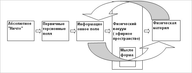 «Абсолютное ничто» порождает первичное торсионное поле кручения, которое в свою очередь порождает физический вакуум. Физический вакуум есть носитель всех остальных полей: электромагнитного, гравитационного и вторичного торсионного, информационного, которое порождается материальным веществом, помещенным в вакуум. Материальное вещество состоит из атомов, которые имеют ядро и вращающиеся вокруг него электроны. Электроны могут переходить с орбиты на орбиту, при этом процессе излучается электромагнитная волна и импульс собственного вращения электрона вокруг своей оси, назуваемый спин. Так как в структуре атома всегда присутствует вращение электронов вокруг своей оси, то всегда присутствует вектор направления движения, собственный момент вращения, не связанный с перемещением самой частицы. Оторванный от материальной, вещественной, имеющей массу частицы, момент вращения, импульс, вектор, несет информацию о состоянии покинутой им частицы. Именно этот «импульс собственного вращения», называемый спин, вектор направления движения, несет информацию о былом вращении частицы, электрона. Волны спинов различных частиц от атомов вещества вакуума, несущие информацию о помещенном в вакуум физическом веществе, живом или неживом, создают вторичное торсионное поле. Сознание человека есть продукт деятельности мозга, который производит генерирование волн спинов, от вращения атомов, из которых состоит вещество мозга. Эта информация, заложенная в волнах спинов есть торсионное, информационное поле мышления человека, о состоянии его ежесекундного мышления. Вращение Земли, вокруг своей оси создает свое торсионное, информационное поле о ежесекундном состоянии планеты Земля. Вращение Солнца, вращение Галактики, вращение Вселенной, вращение Пространства, каждое вокруг своего центра вращения создают свои торсионные, информационные поля. Высший уровень реальности представляет собой Абсолютное НИЧТО, Пустоту, Божественную Монаду, имеющую какую-то степень кривизны и параметры кручения. Изменение этих параметров кривизны и кручения должно приводить это НИЧТО или к состоянию неупорядоченному или к упорядоченному. Наличие Сверх Сознания Первичного, заставляет это Ничто прийти к упорядоченному и подчиненному ему состоянию. Но описать это Высшее Сверх Сознание НЕВОЗМОЖНО! Пока, еще, сегодня, человеку. Основной энергией, действующей на верхних уровнях, является психическая энергия. Это энергия Сознания, Высшей Мысли. Состояние кручения и кривизны Пространства Высшего Уровня, назовем его НИЧТО, приводит к образованию первичного торсионного поля. Это информационное поле вращения представляет собой энергетические завихрения, микро вихри, которые заполняют весь объем Пространства. Эти микро вихри имеют противоположные направления вращения: правосторонние и левосторонние. Они не несут энергию, но переносят информацию. Эти вихревые торсионные поля правого и левого вращения образуют второй уровень после Абсолютного Ничто. Это уровень Поля Сознания Вселенной. В этом поле заложена информация Абсолюта о всей, созданной ИМ Реальности. Это его банк данных, в котором заложена программа эволюции Всего Сущего. Третий уровень представляет собой вакуум, эфирное пространство древних ведических зданий. В теории вакуума существует два вида торсио