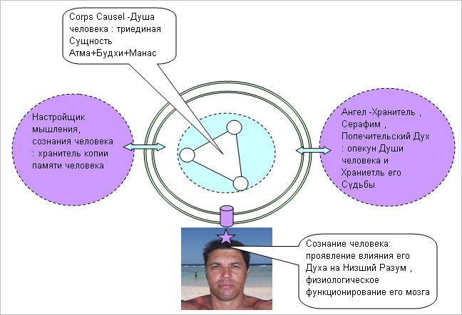 Этот высший Попечитель вселенного Духа человека является Хранителем его судьбы, его Опекуном. Он знает кармическую задачу данного воплощения Духа в физическое тело, и старается максимально возможно способствовать выполнению Духом своей кармической задачи. Он ведет «за ручку» Дух вселенный в тело, невидимо направляя его по жизненным ситуациям, следя за тем, чтобы задачи кармы выполнялись. Первоначально Серафимы посылались в соответствии с принадлежностью человека к той или иной расе. После прохождения Владыкой нашей Локальной Вселенной Михаилом, миссии Посвящения в теле Иисуса из Назарета две тысячи лет назад, Серафимы получают свое назначение к человеческому Духу в зависимости от развития человеком своей духовности и интеллекта. Итак! Два ангела ведут человека по жизни в проявленном, плотном мире, где человек получает свой опыт жизни, они же сопровождают Дух человека по тонким планам бытия после его физической смерти. Это его персональный Серафим, Ангел Хранитель и его личный Настройщик Мышления, его Сознания. Это Божественная Сущность является личным Посланником Бога Отца в каждом человеке. Настройщик Мышления вселяется в сознание человека после четырех-пяти месяцев жизни. Что это за Высшая Сущность, Настройщик Мышления? Разбираемся. Полноценная умственная деятельность физического мозга человека отражает состояние его Низшего Сознания, его Разума, а фактически его мозга. Не секрет, что мы, люди, отличаемся один от другого каждый своим мышлением, своими взглядами, своим умственным потенциалом и объемом знаний. Производная от деятельности физического мозга человека является его Разум и называется Низшим Сознанием человека. Так как Разум, Низшее Сознание являются производной от деятельности мозга человека, его биохимических процессов, то физическое здоровье мозга крайне важно. Кто же дает знания Низшему Сознанию человека? Если провести аналогию, то мозг человека можно сравнить с жестким диском памяти компьютера, который изначально сходит с конвейера производства «чистым», незаполненным, но подготовленным к приему информации. На него установлен определенный Soft, программа оперативного управления. Но память, как и мозг новорожденного ребенка чист. Знания начинают поступать к нему как из внешнего, окружающего мира, так и изнутри. Внутреннее руководство Низшим Сознанием человека осуществляет его личный представитель Бога Отца Всевышнего, его внутренний Настройщик Мышления. Именно он, при Волевых Усилиях человека, выраженных в генерировании им мысленных волн определенной высшей частоты вибраций: высокие мысли творческого человека, ученого, любящего, сострадающего другим, молящегося Богу, определяет какой поток информативной энергии следует дозировано направить сначала по микро каналам мозговых волн Устремления, а затем уже и по устойчиво построенному, активированному, открытому каналу связи с тонким планом, каналом называемым Антахкараной, или его сегменту, части. Постараемся разобраться в этом таинственном Посланнике Бога к Душе каждого человека, который запущен в путешествие по проявленному плану Бытия Владыкой нашей Локальной Вселенной, Божьим Сыном Михаилом.