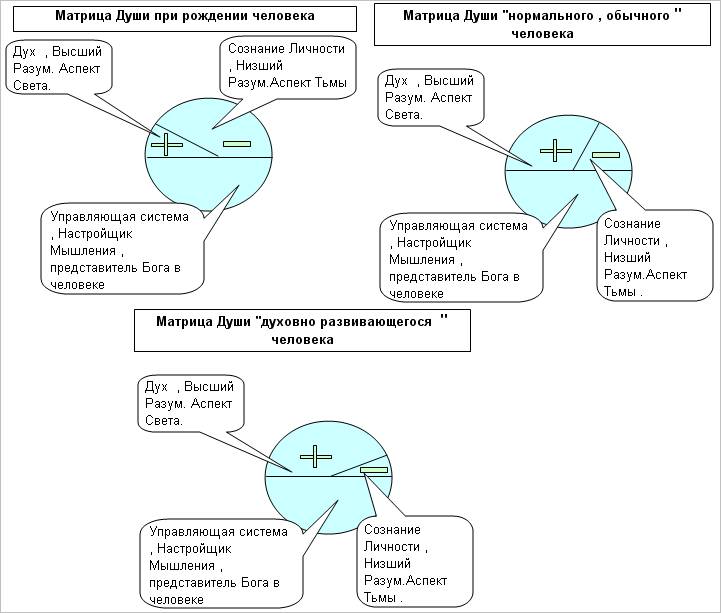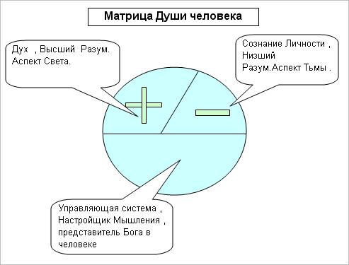 Матрица Души человека состоит из трех взаимозависимых частей: Дух, Разум и Управляющая Система. Разбираемся. Дух это Высший аспект Разума, Высшее Сознание человека, та индивидуальная частица Бога Отца в человеке, которая запушена для жизни и получения опыта в проявленном, плотном, физическом мире. Эта частица получает и сохраняет всю информацию, полученную при всех прожитых ею жизнях в различных телах человеческих. Эту чистую, высокочастотную энергию насыщающей жизни физического тела человека, можно сравнить с потоком положительной, чистой энергии света, добра. В математике это есть энергия со знаком плюс, что подразумевает излучение, отдачу, испускание света, знаний, любовь. Другая часть матрицы души это Сознание Личности, Низший Разум, желания, ощущения физического тела, организма. Они несут в себе аспект тьмы, привнесение низкой, отрицательной энергии, а также не любовь. Математически это есть энергия со знаком минус, что подразумевает поглощение, прием света, тьму. И третья составляющая матрицы души человека это его Управляющая система, его Настройщик Мышления, то что является функцией, законом управления этих двух величин. Если перейти на язык математики, то матрица Души есть функция Y= F(х), где Y-это Дух, Высший разум, Х-это Эго, Личность, Низший разум, а F – это функция, закон управления этими двумя величинами, тот самый Божественный Настройщик Мышления. В новорожденном малыше, Y – Дух, является латентной, ждущей своего часа, своего развития величиной. Он составляет малый процент от общего объема энергий Матрицы Души. Эго, эгоическая составляющая, личностная, которая является следствием желаний физиологического, плотного тела, это Низший Разум, низкочастотная составляющая Души. При рождении, она имеет превалирующий, больший процент энергий в общем объеме матрицы Души. Общий процент энергий (у+х), (Духа +Личности) не может превышать 49% процентов всего объема энергий этой тонкой структуры, хотя между собой эти величины могут иметь совершенно разное соотношение. Третья, управляющая часть Матрицы Души, Настройщик Мышления, всегда имеет полные 51% процентов. Это нейтральные энергии, с аспектом Бога Отца. Это не минус и не плюс, так как Бог Отец любит все свои Творения, все Создания, поэтому он нейтрален. Он только управляет, задает основные энергетические и допустимые, вероятностные параметры Матрицы Души. Он является той связующей функцией F, без которой не возможно, или нецелесообразно взаимное существование У и Х. Структура Матрицы Души построена так, что суммарная составляющая функций (Y +X) не могла бы вырасти более чем 49% от общего объема. Управляющая система всегда имеет свои 51%, поэтому она всегда имеет превалирующее влияние над суммой (Y+X). Это означает, что присутствие Бога в Матрице Души человека всегда является доминирующим фактором, основным вектором его духовного в развития. При росте организма ребенка, особенно после четвертого месяца, когда в него вселяется Настройщик Мышления, соотношение Духа и Личности начинается видоизменяться. Больший процент получаемой, входящей энергии приходится на энергии света, Духа, плюсовые энергии. В человеке, ставшем на Путь духовного развития, процент Высших духовных энергий начинает достигать до 90% процентов. Стоящий на Пути, Стремящийся к Высшему Знанию, постоянно усмиряя, беря свои 