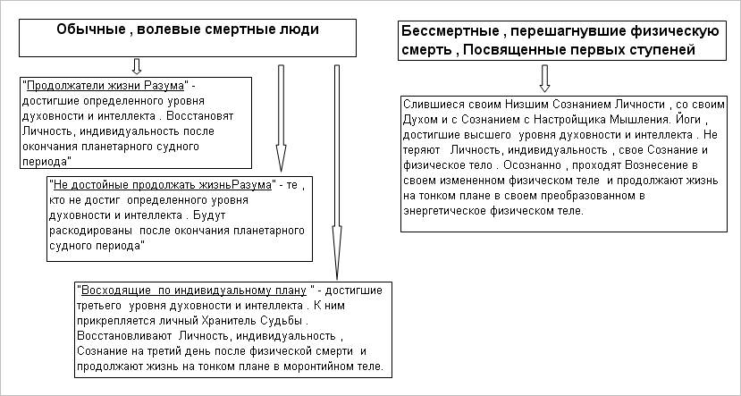 Все люди на Земле отличаются один от другого параметрами своих физического и тонких тел. Эти различия ведут при каждом новом воплощении к жизням, которые также отличают одного человека от другого. Но смерть физического тела неотвратимо идет по пятам любого человека постепенно сокращая дистанцию между собой и воплощенным в тело Духом. По своим внутренним характеристикам, по набору энергий в матрицу Души, человеческий род подразделяется на обычных, волевых смертных людей и волевых людей, сумевших в одном из воплощений перешагнуть через барьер, порог смерти.