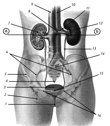 1 – мочеиспускательный канал; 2 – правая седалищная кость; 3 – мочевой пузырь; 4 – копчик; 5 – правая подвздошная кость; 6 – тазовое кольцо; 7 – правая почка; 8 – левая почечная вена; 9 – нижняя полая вена; 10 – брюшная часть аорты; 11 – левая почечная артерия; 12 – левая почка; 13 – левый мочеточник; 14 – крестец; 15 – лобковое сочленение; 16 – лобковые кости; линия А – Б – срез на уровне XII грудного позвонка (вид сверху см. на рис. 2)