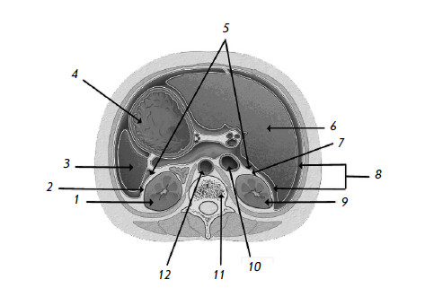 1 – левая почка; 2 – околопочечная жировая клетчатка левой почки; 3 – селезенка; 4 – желудок; 5 – брюшина, покрывающая почки; 6 – печень; 7 – околопочечная жировая клетчатка правой почки; 8 – брюшная полость; 9 – правая почка; 10 – нижняя полая вена; 11 – XII грудной позвонок; 12 – брюшная часть аорты