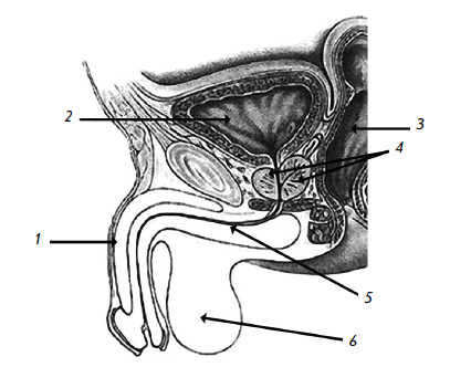 1 – половой член; 2 – мочевой пузырь; 3 – прямая кишка; 4 – предстательная железа; 5 – мочеиспускательный канал; 6 – мошонка и яички