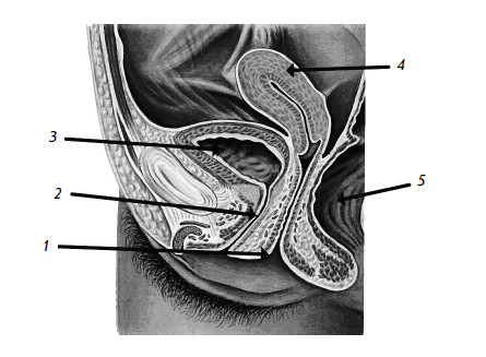 1 – влагалище; 2 – мочеиспускательный канал; 3 – мочевой пузырь;
