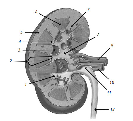 1 – малая почечная чашка; 2 – нефрон (см. подробнее на рис. 6 и 7); 3 – почечная пазуха; 4 – почечный сосочек; 5 – корковое вещество почки; 6 – почечная пирамида мозгового вещества почки; 7 – почечные столбы коркового вещества почки; 8 – большая почечная чашка; 9 – почечная артерия; 10 – почечная вена; 11 – почечная лоханка; 12 – мочеточник рис. 5).
