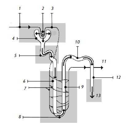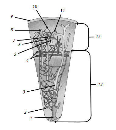 4 – мозговые артерия и вена; 5 – дистальный извитой каналец; 6 – капсула Шумлянского – Боумена; 7 – клубочек; 8 – проксимальный извитой каналец; 9 – капсула почки; 10 – приносящая артериола; 11 – выносящая артериола; 12 – корковое вещество почки; 13 – мозговое вещество почки