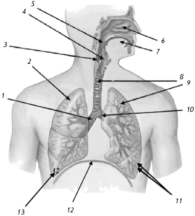 1 – правый главный бронх; 2 – правое легкое; 3 – пищевод; 4 – гортань; 5 – носоглотка; 6 – полость носа; 7 – язык; 8 – трахея; 9 – левое легкое; 10 – левый главный бронх; 11 – бронхиолы; 12 – диафрагма; 13 – ацинус (в увеличенном масштабе см. рис. 3)