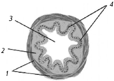 1 – фиброзно-мышечно-хрящевой слой; 2 – слизистая оболочка; 3 – просвет бронха; 4 – реснитчатые клетки