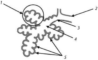 1 – альвеолярный мешочек; 2 – конечная бронхиола; 3 – дыхательная бронхиола; 4 – альвеолярный ход; 5 – альвеолы