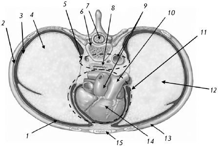 1 – плевральная полость; 2 – листок пристеночной плевры; 3 – листок легочной плевры; 4 – правое легкое; 5 – заднее средостение; 6 – тело позвонка; 7 – спинной мозг; 8 – пищевод; 9 – аорта; 10 – легочная артерия; 11 – переднее средостение; 12 – левое легкое; 13 – ребро; 14 – сердце; 15 – грудина