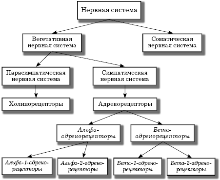 Связь между нервами и органами осуществляется при помощи специальных структур – синапсов и рецепторов. Возникший в центральной нервной системе управляющий импульс проходит по нервному волокну до самого его окончания. На кончике нервного волокна имеется специальное образование, которое называют синапсом. Синапс реагирует на управляющий импульс выделением химического вещества – передатчика (медиатора), который воспринимается рецептором внутреннего органа. И уже этот рецептор, получив сигнал, побуждает орган к тому или иному действию. В парасимпатическом отделе вегетативной нервной системы таким передатчиком является ацетилхолин, а в симпатической системе – норадреналин. Поэтому все рецепторы подразделяются на холинергические и адренергические. Эти рецепторы находятся практически во всех органах и тканях, но в разных количественных соотношениях. Поскольку симпатическая и парасимпатическая нервная система действуют антагонистически, то соответственно стимуляция холинорецепторов и адренорецепторов приводит к противоположным эффектам. Так, например, стимуляция холинорецепторов сердца приводит к урежению его сокращений, бронхов – к их сужению. И наоборот, стимуляция адренорецепторов приводит к учащению сердцебиения и расширению бронхов.