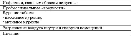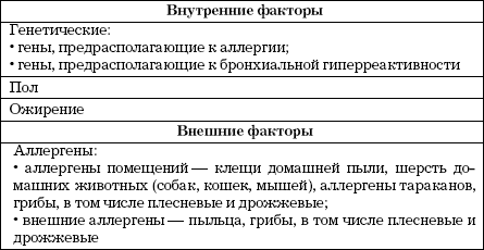 Различают две группы факторов, способствующих возникновению бронхиальной астмы. Одну группу называют внутренними факторами. К ним относятся характеристики, присущие самому организму. Ко второй группе относят внешние факторы, среди которых наиболее значимыми являются аллергены, инфекции, профессиональные «вредности», курение, загрязнение воздуха внутри и снаружи помещений[15] (табл. 1). Внутренние факторы предрасполагают к заболеванию, а внешние провоцируют возникновение заболевания.