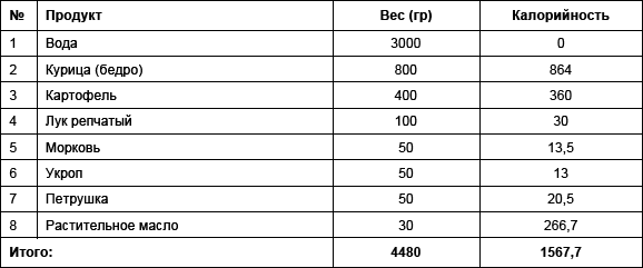 Попробуем сварить суп. Для этого все, что кладем в кастрюлю, вначале взвешиваем и, исходя из веса на упаковке продукта и из данных табл. 2.2, рассчитываем калорийность. Таблица 2.2 этот процесс наглядно иллюстрирует.