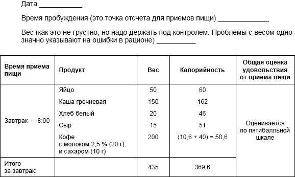 Итак, осталось дело за малым – в соответствии с полученными рекомендациями выстроить свой рацион таким образом, чтобы не ощущать дискомфорта от недоедания, которое часто сопровождает диеты, и в суточной калорийности выйти в дефицит. В решении этого вопроса никак не обойтись без ведения пищевого дневника, где отражаются важнейшие данные. Не стоит надеяться на свою память: во-первых, такое количество информации не удержится в ячейках кратковременной памяти, а во-вторых, уж слишком сильны порой защитные механизмы вытеснения, которые напрочь стирают воспоминание о ненароком съеденной шоколадке. Пищевой дневник может вестись по такой форме:
