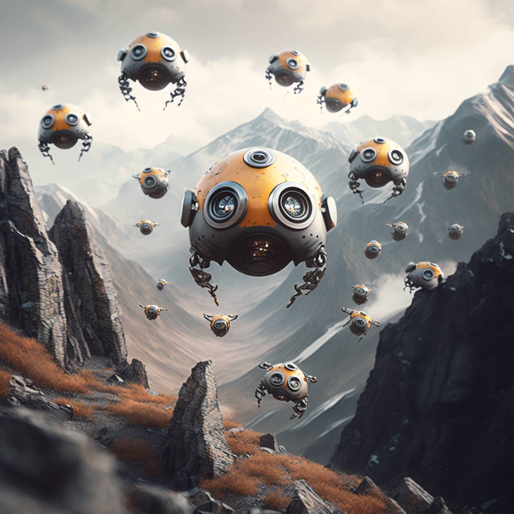 Рисунок 1. Рой роботов исследуют местность. Сгенерировано с помощью Midjourney.