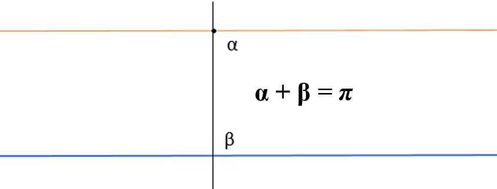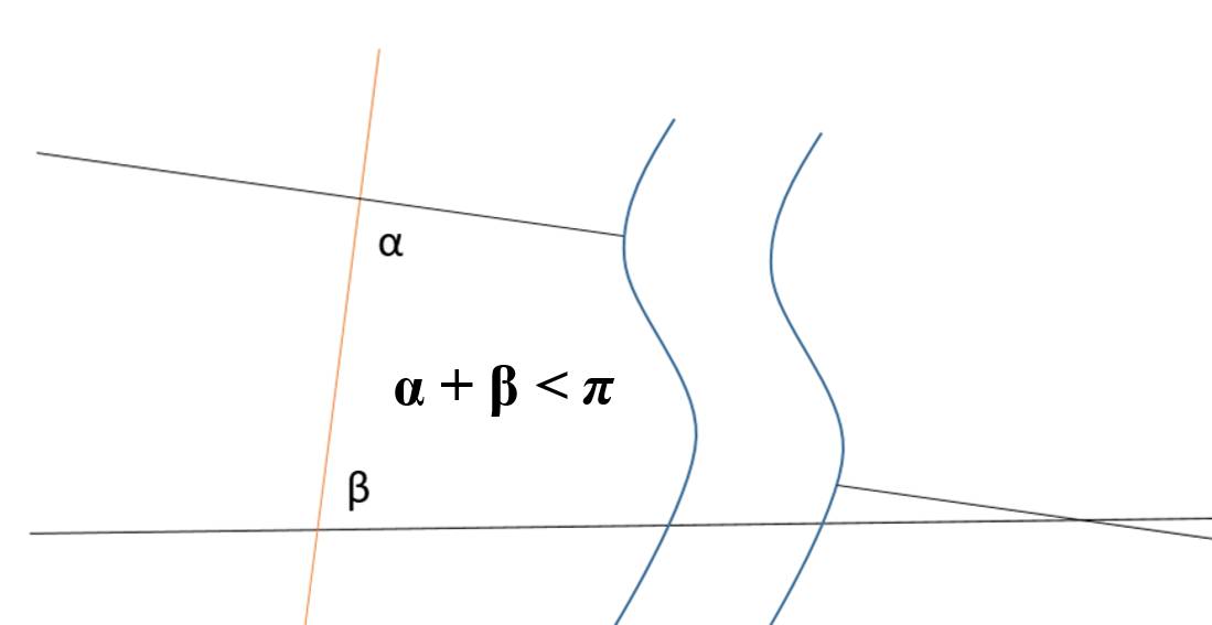 Этот постулат или аксиома, в самой распространенной трактовке утверждает, что если две прямые линии пересекает третья прямая линия, и с одной стороны от нее сумма внутренних углов меньше двух прямых углов, то первые две прямые линии с этой стороны обязательно пересекутся (чертеж №1).