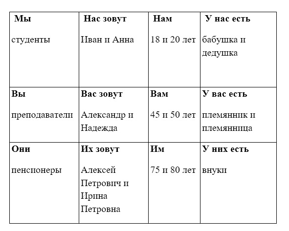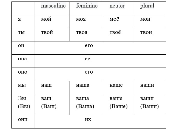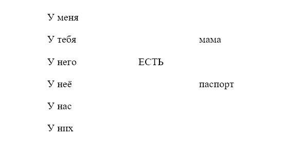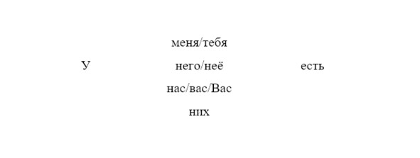 We have already said that the expression у меня есть means I have. This is a preposition, after which the genitive is used. Personal pronouns in the genitive case except он, она, оно have the same forms as in the accusative case. The primary meaning of the Russian genitive case is to show possession.