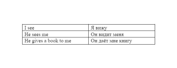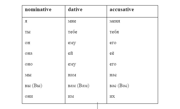 As you know, there are six cases in Russian: nominative, genitive, dative, accusative, instrumental and prepositional. Pronouns also vary in cases. In this tutorial, we’ll talk first about nominative, dative, accusative, and then about genitive. Consider for example the pronouns I. I’m nominative (who), me accusative (whom), me dative (to whom). Compare the following sentences in English and Russian.