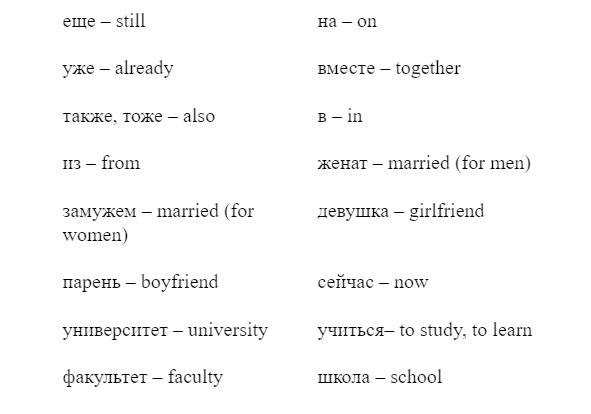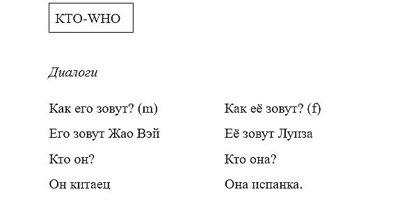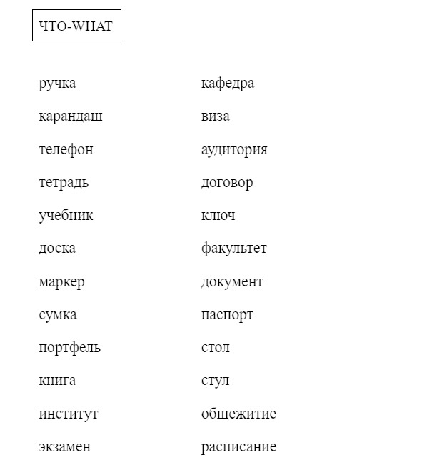 1. Who is it? 2. What is it? 3. Where is it? 4. What do you do? 5. Where do you study? 6. Where do you work? 7. Where are you from? 8. Where does she live? 9. How long do you live in Russia? 10. Where do you live? 11. How long do you learn Russian? 12. What do you say? 13. What do you write? 14. What do they listen to? 15. How old are they? 16. Do you eat meat? 17. Do you understand the text? 18. Who asks? 18. Why does she learn Russian? 19. What’s your name? are you? 20. How much costs the book?