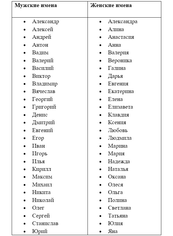 For example, Elena/Lena, Ivan/Vanya, Yelizaveta (Elizabeth) /Lisa. Almost all male names in full form end with a consonant (exception, Nikita, Ilya), female with «a» or «я» vowels (exception Lyubov’). Several names can be used for both men and women. For example, Alexander/Alexandra, Eugeniy (Eugene) /Eugenia, Valery/Valeria
