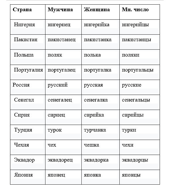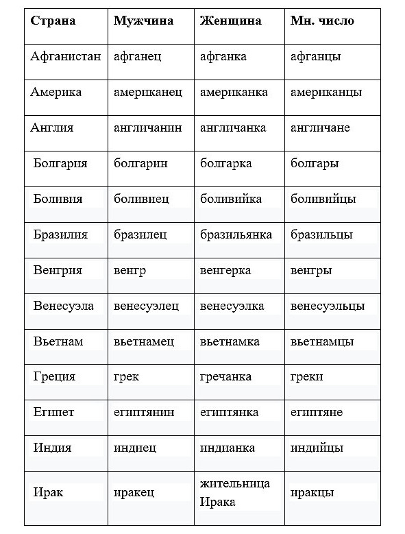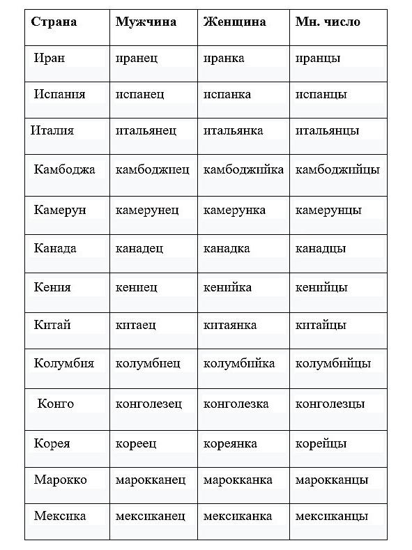 Names of countries in Russian are consonant with their names in European languages. Note that the nationalities of men end with a consonant (the majority has an ending – ец), women with vowels (the ending is -ка). The plural has endings ы or и.
