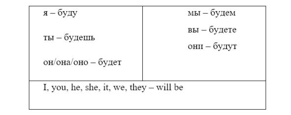 In the future tense the verb has 4 forms: буду, будешь, будет, будем, будете, будут.