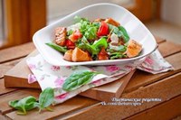 9. Салат выложите на тарелку. Обжаренные кусочки семги переложите на тарелку с салатом.
